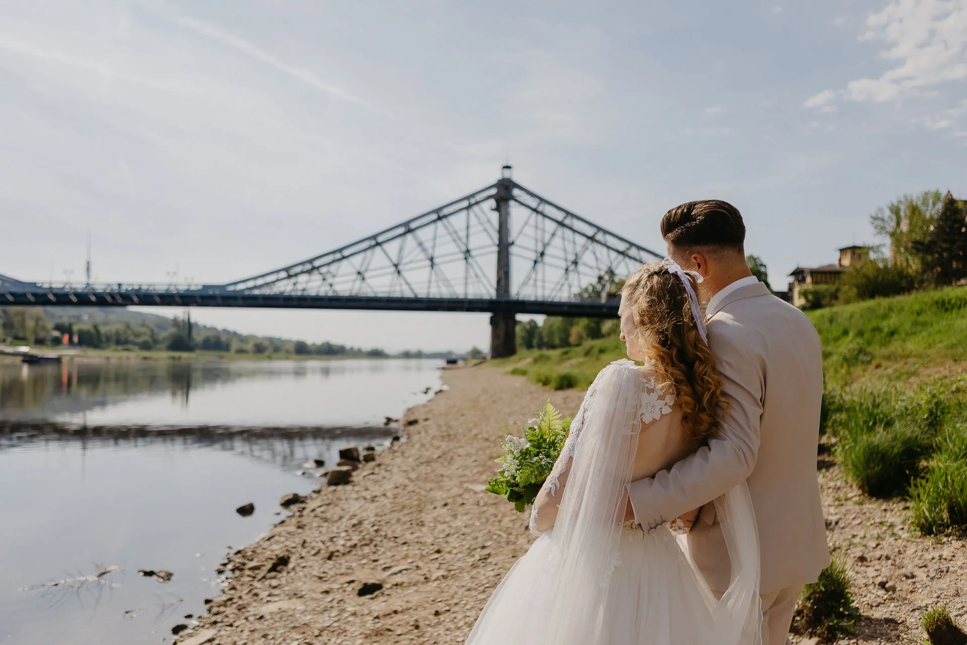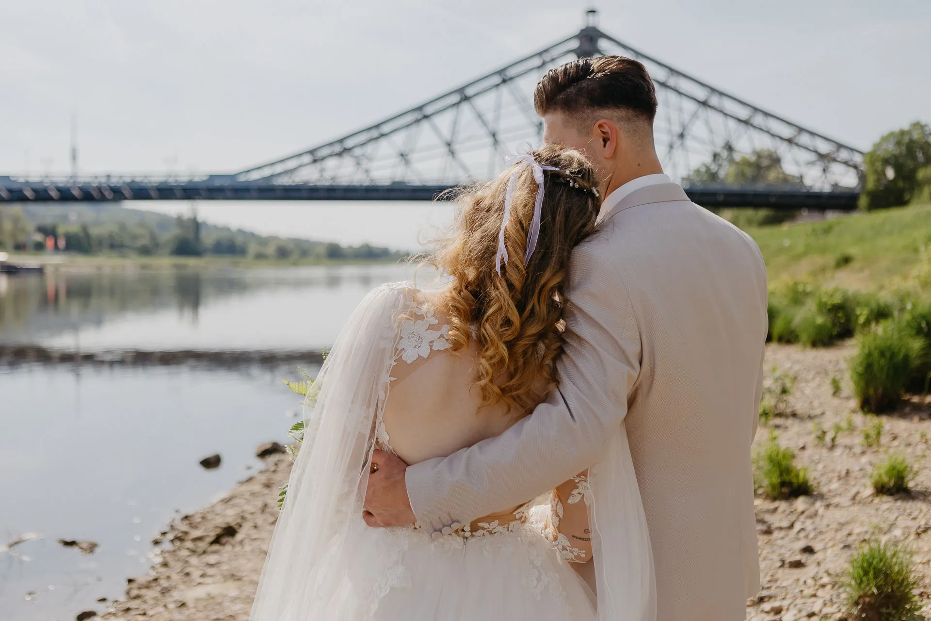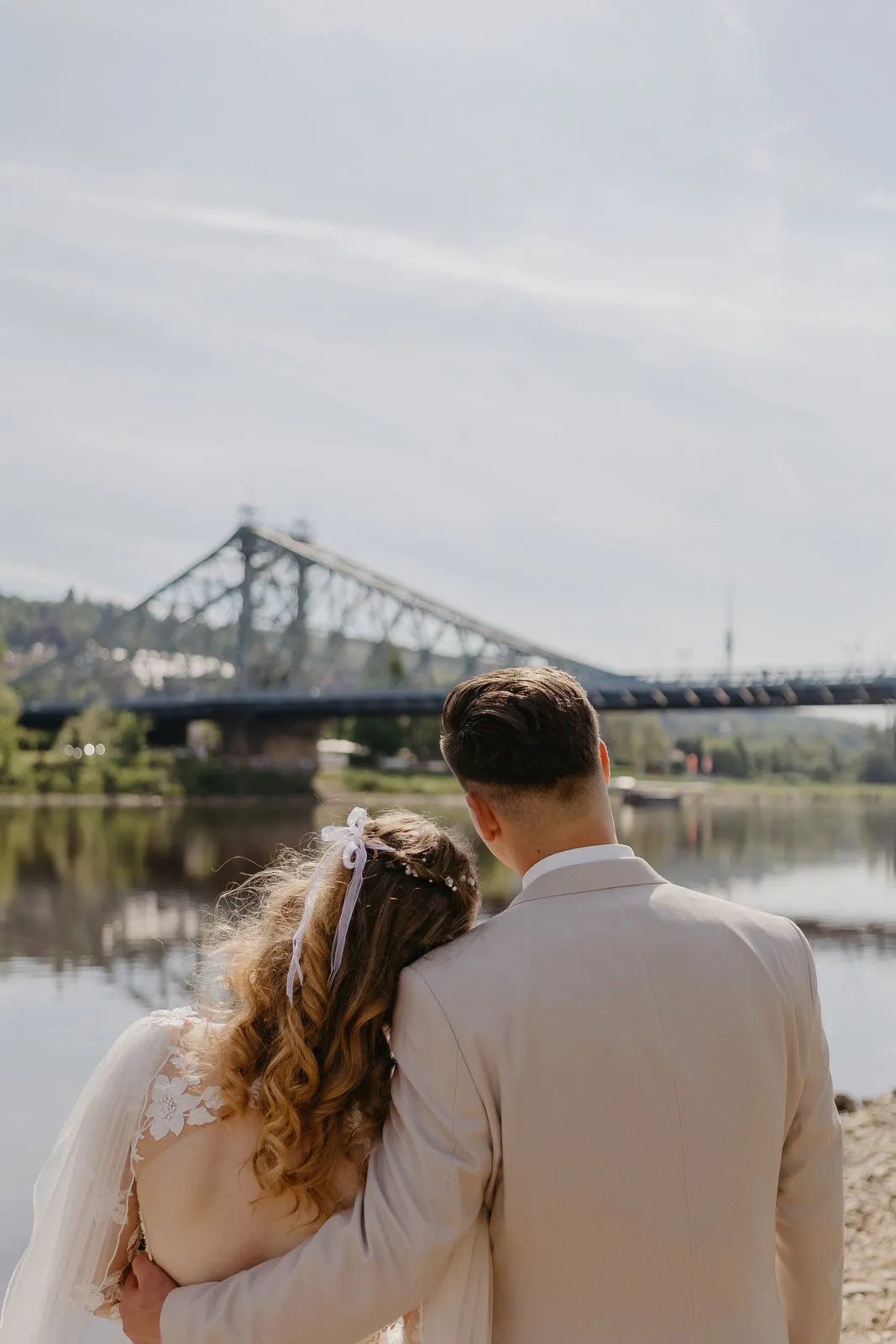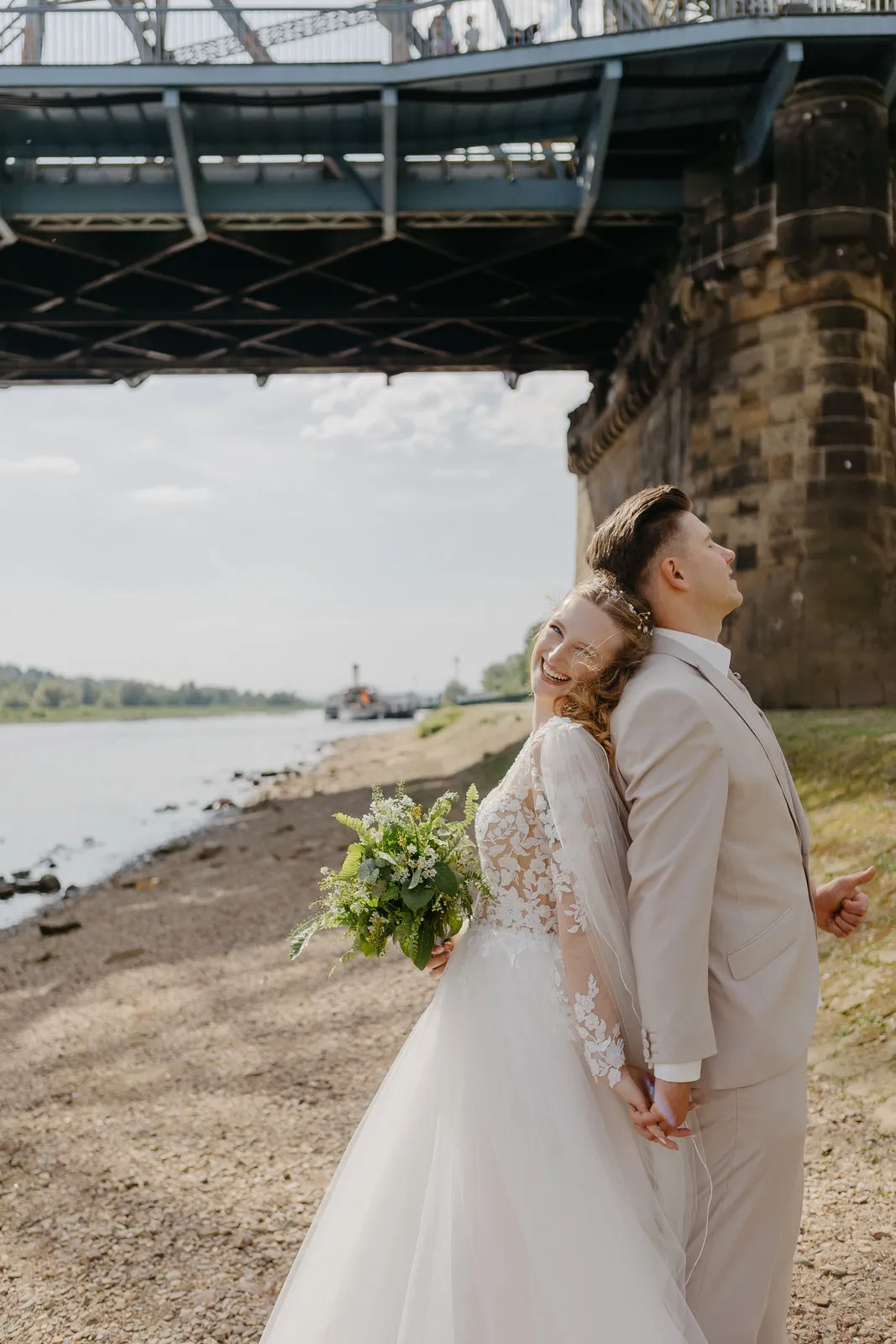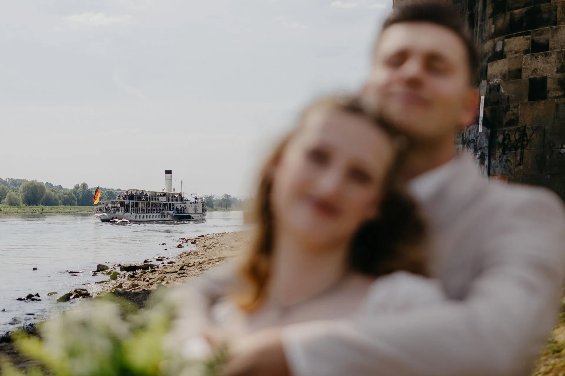 Nach der Trauung zog die kleine Gesellschaft – bestehend aus den engsten Freunden und der Familie – gemütlich entlang der Elbe Richtung Blaues Wunder. Eine Strecke, die nicht nur traumhaft schön ist, sondern auch viele Gelegenheiten für spontane Fotos bietet. Und das Beste: Als wir gerade mit den Paarfotos an der Elbe beschäftigt waren, fuhr ein Dampfer vorbei und hupte uns freundlich zu. Ein Moment, der uns alle zum Lachen brachte – und ein echtes Highlight der Reportage wurde.