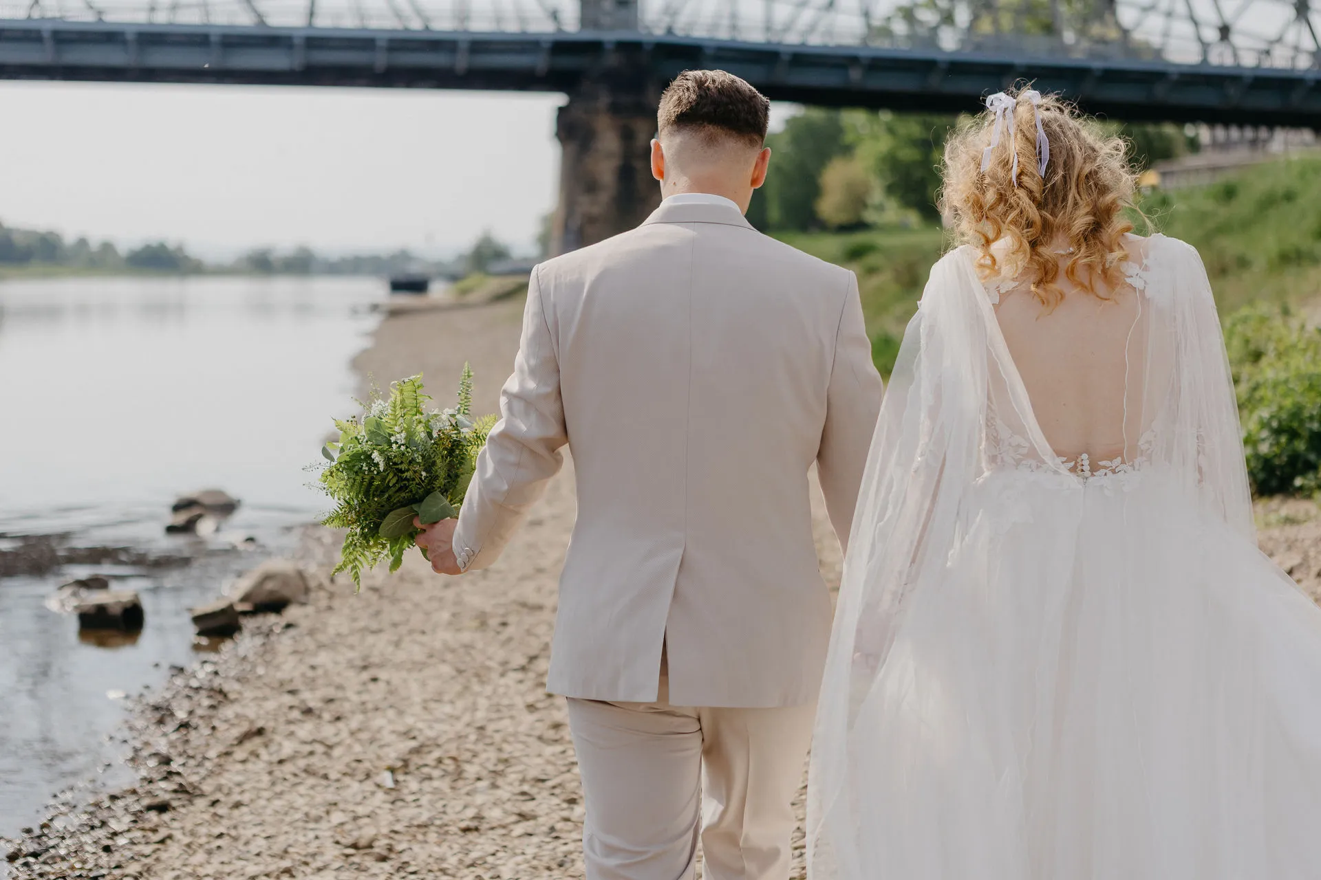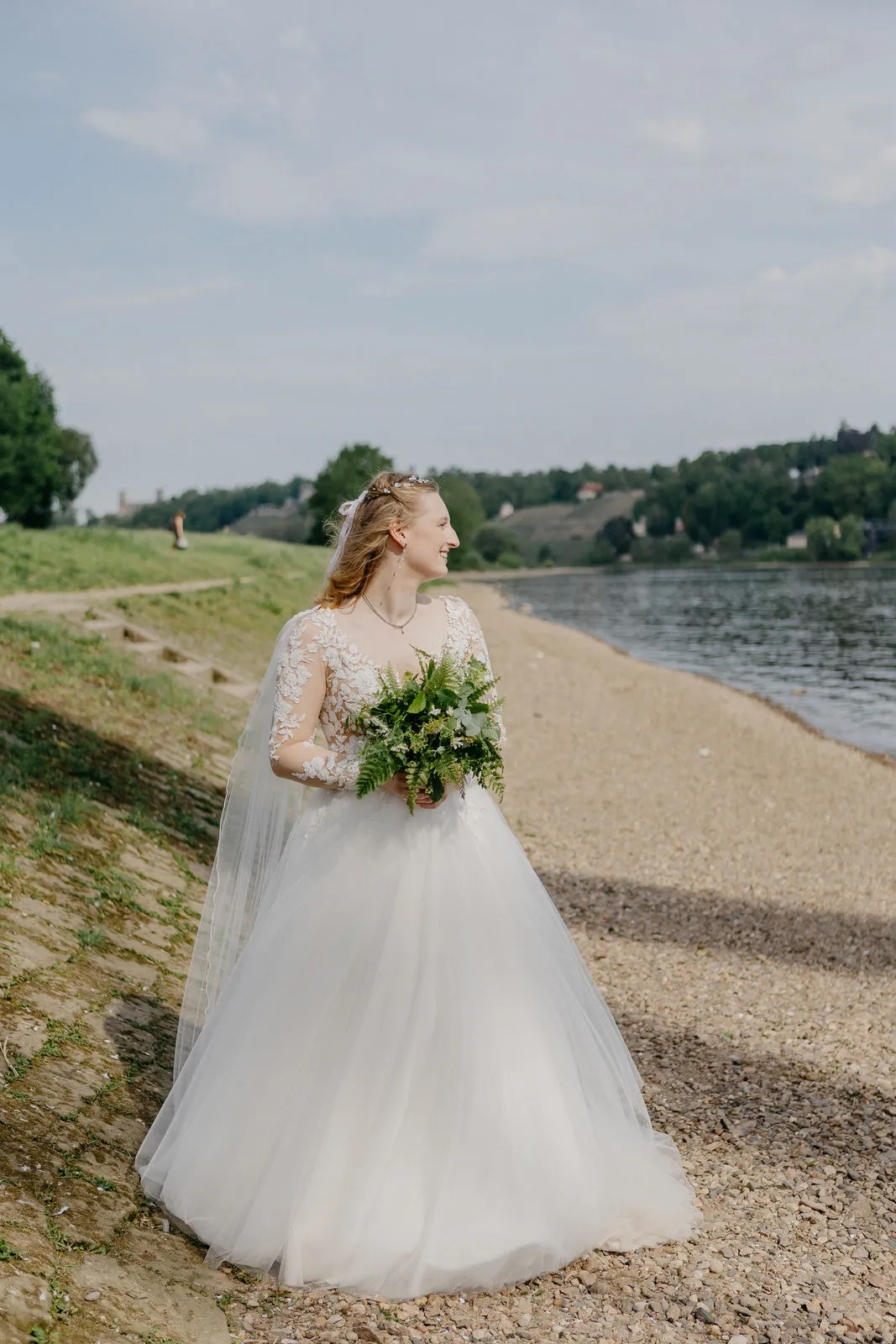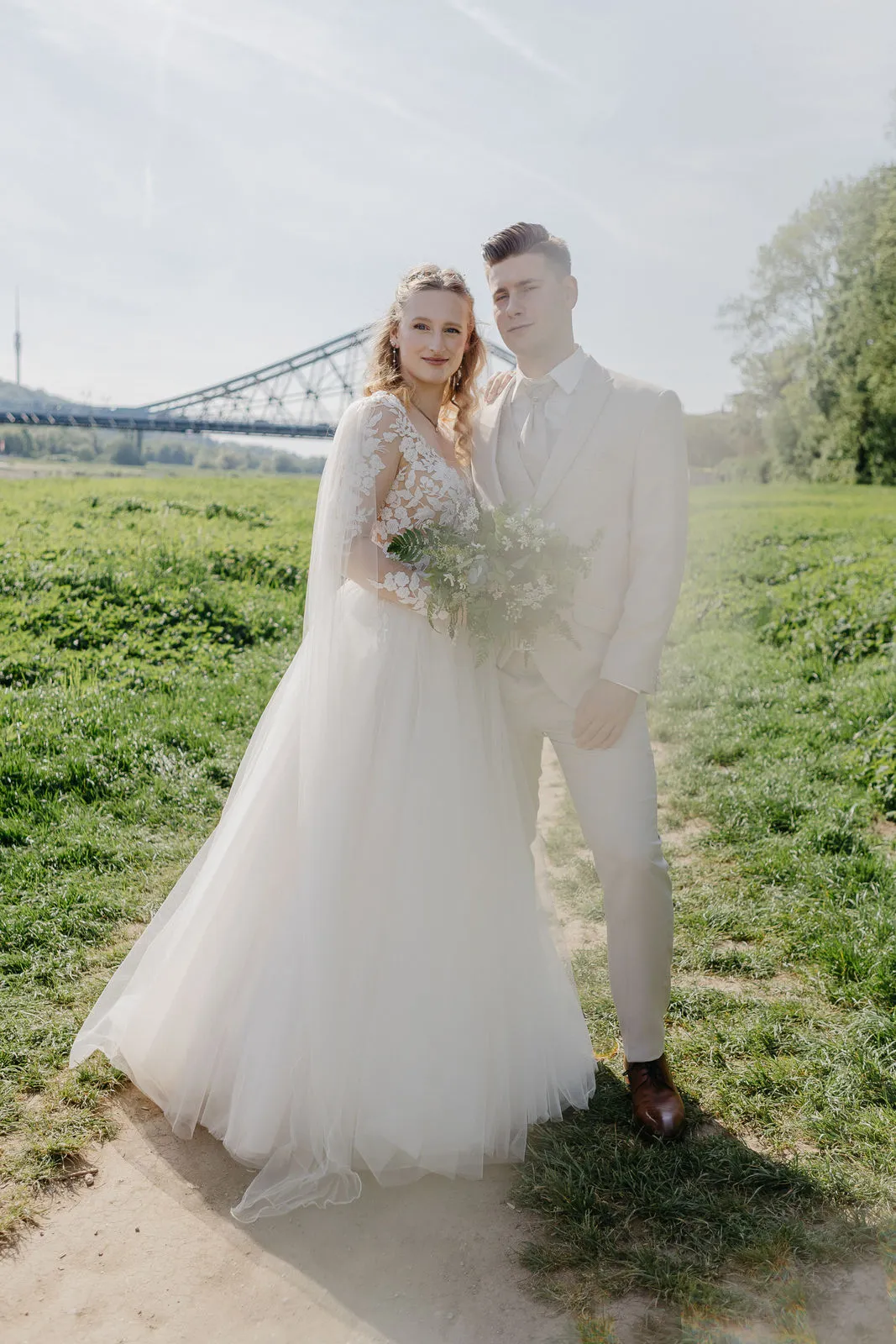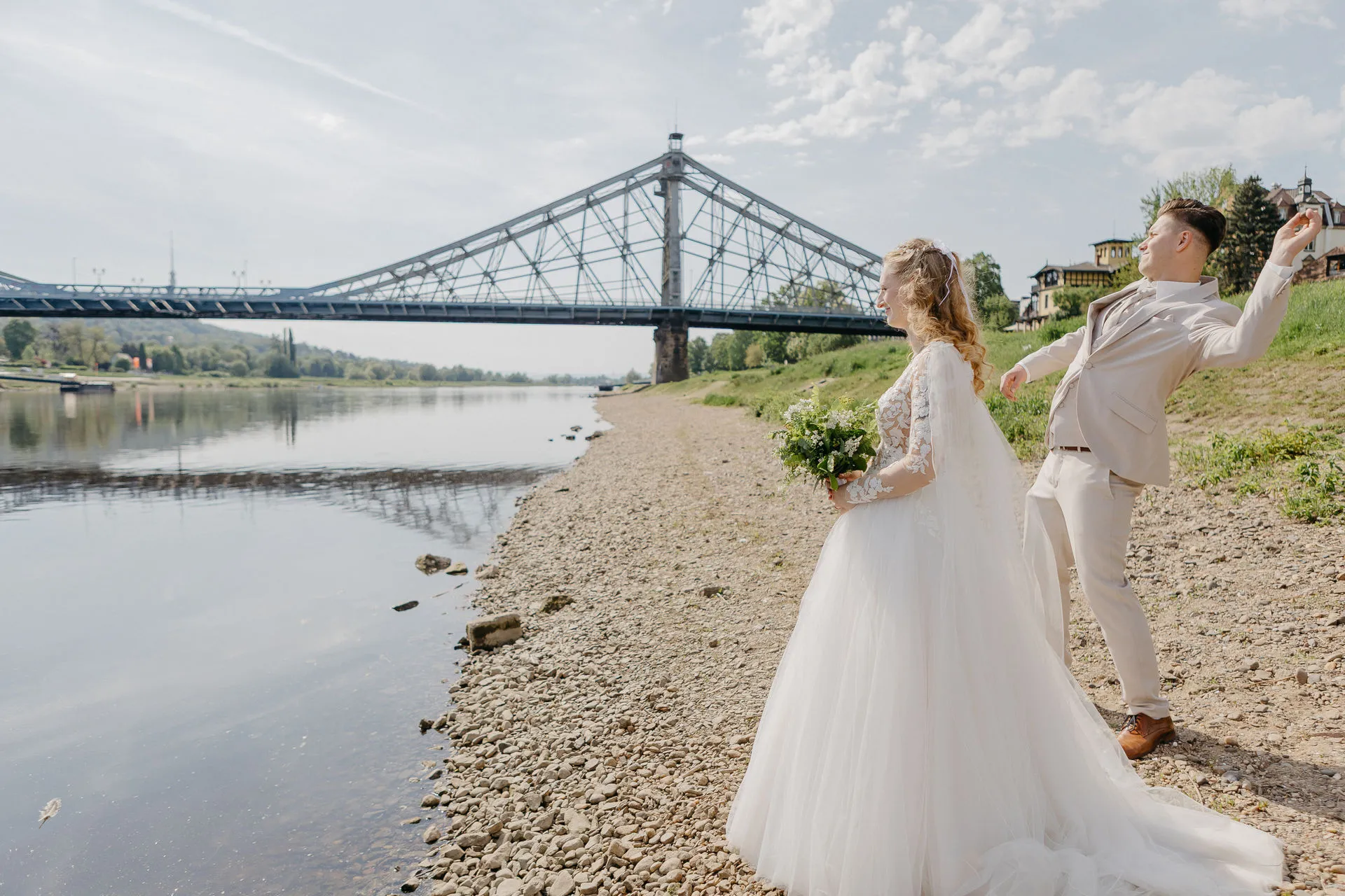 Nach der Trauung zog die kleine Gesellschaft – bestehend aus den engsten Freunden und der Familie – gemütlich entlang der Elbe Richtung Blaues Wunder. Eine Strecke, die nicht nur traumhaft schön ist, sondern auch viele Gelegenheiten für spontane Fotos bietet. Und das Beste: Als wir gerade mit den Paarfotos an der Elbe beschäftigt waren, fuhr ein Dampfer vorbei und hupte uns freundlich zu. Ein Moment, der uns alle zum Lachen brachte – und ein echtes Highlight der Reportage wurde.