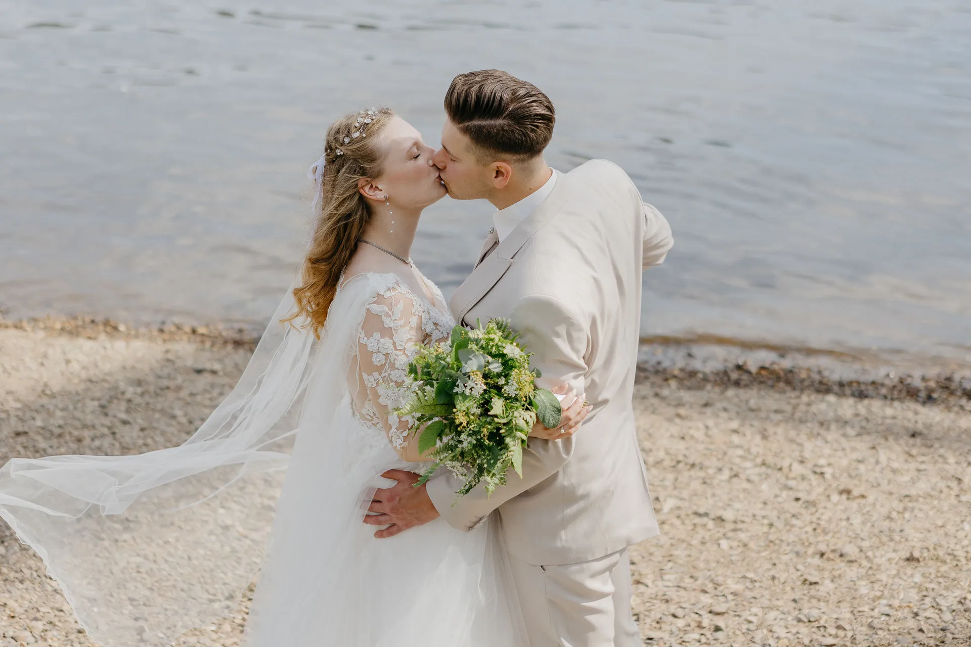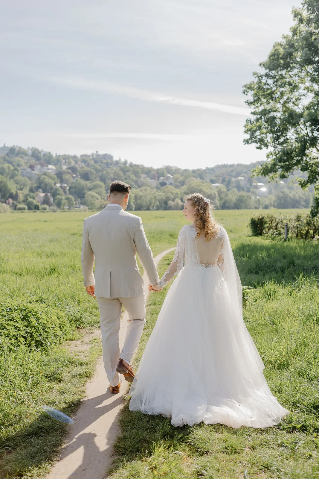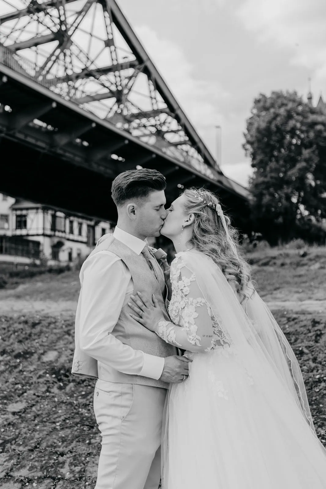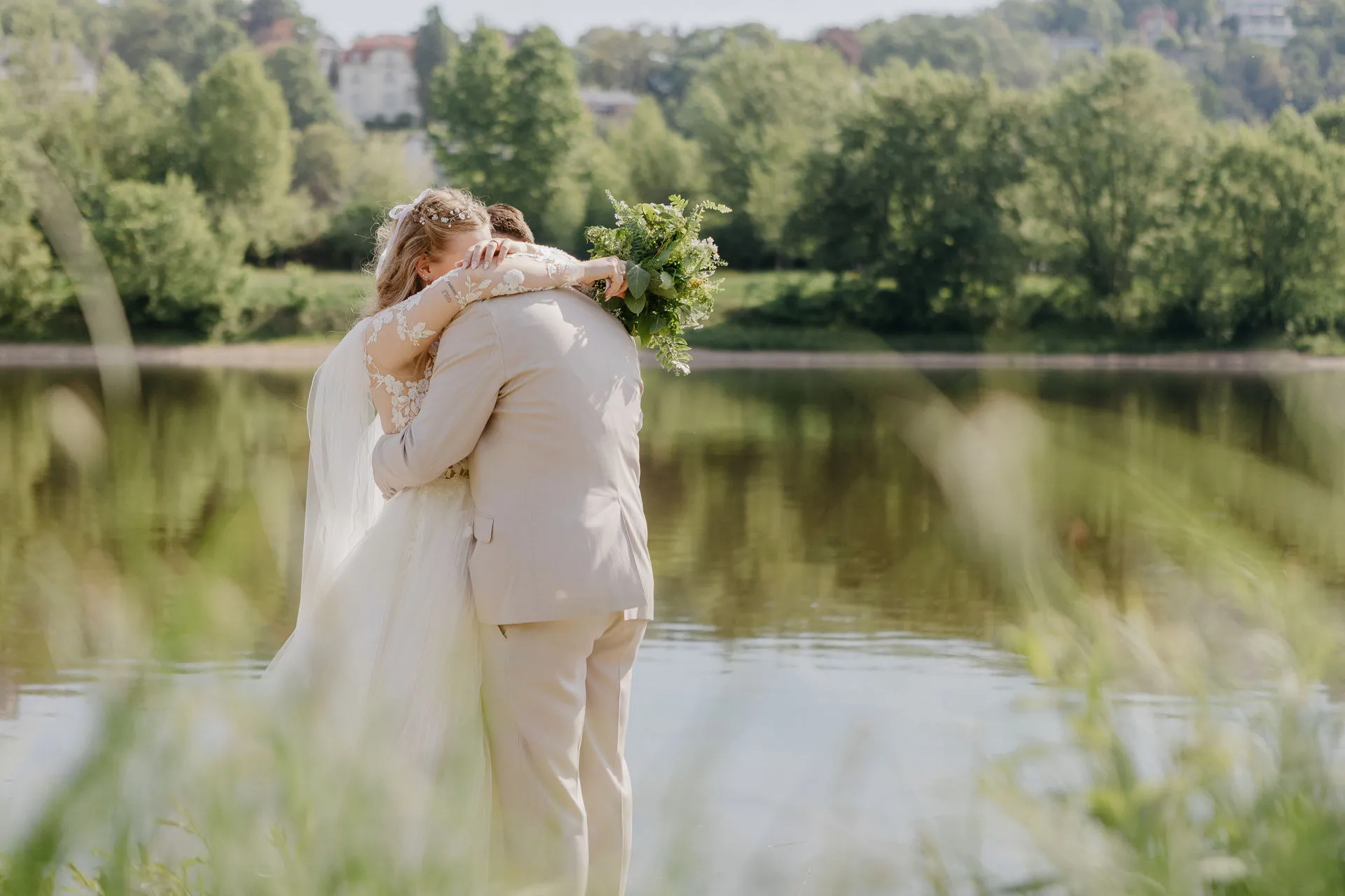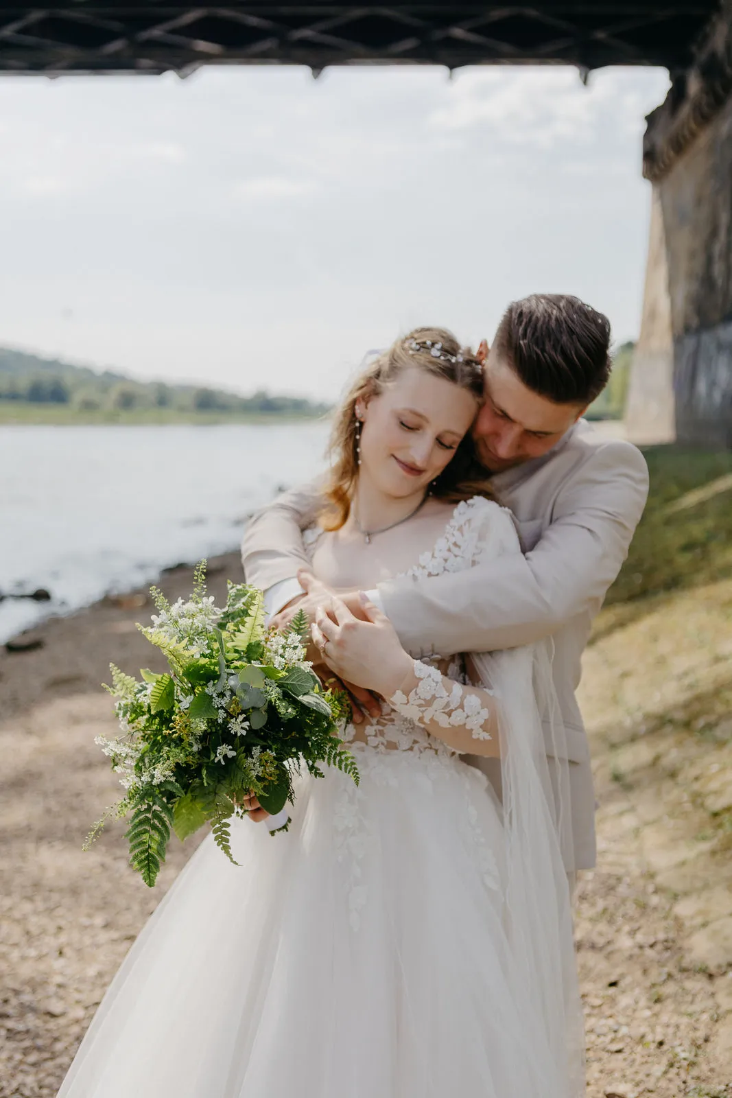 Nach der Trauung zog die kleine Gesellschaft – bestehend aus den engsten Freunden und der Familie – gemütlich entlang der Elbe Richtung Blaues Wunder. Eine Strecke, die nicht nur traumhaft schön ist, sondern auch viele Gelegenheiten für spontane Fotos bietet. Und das Beste: Als wir gerade mit den Paarfotos an der Elbe beschäftigt waren, fuhr ein Dampfer vorbei und hupte uns freundlich zu. Ein Moment, der uns alle zum Lachen brachte – und ein echtes Highlight der Reportage wurde.