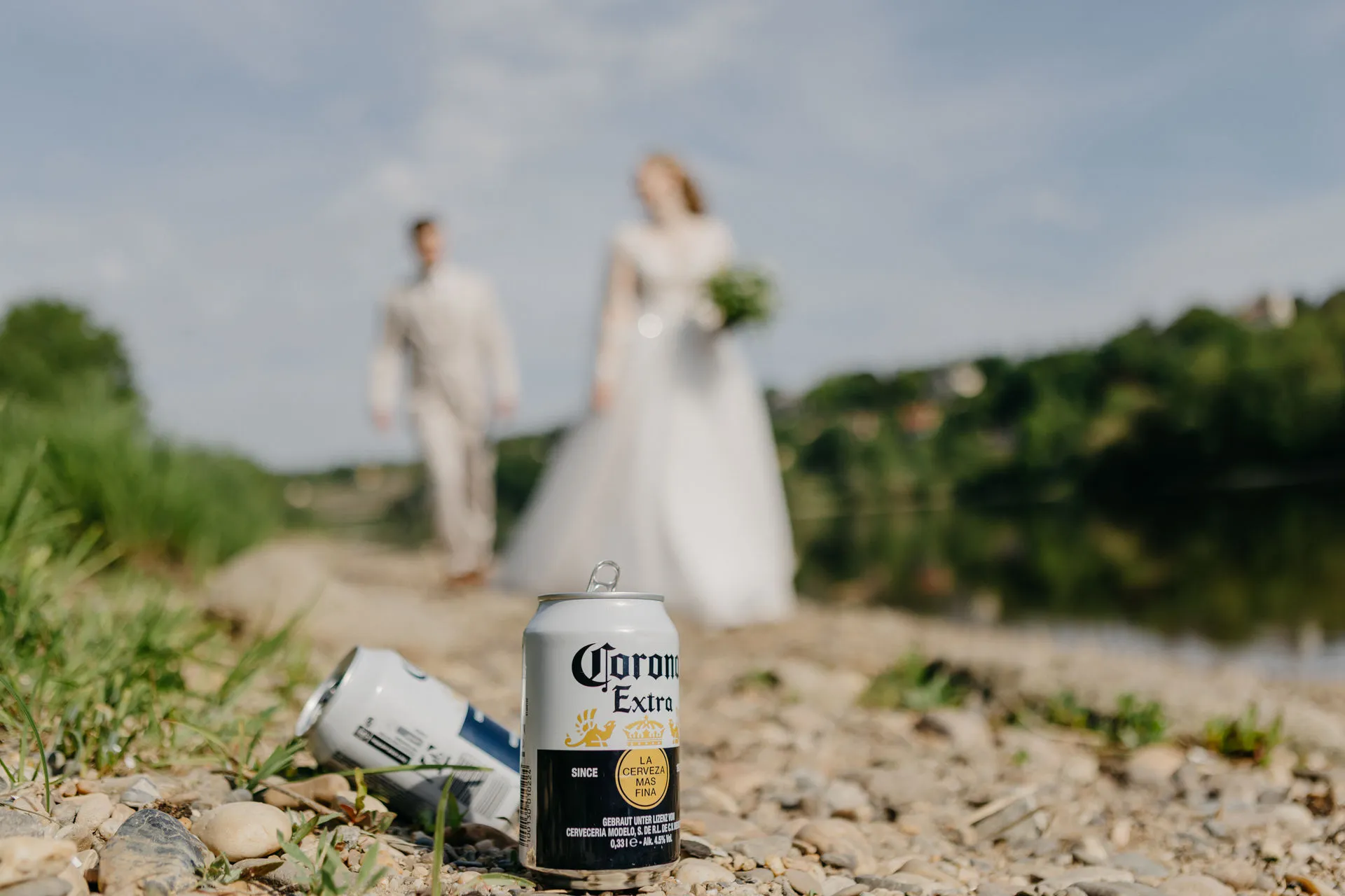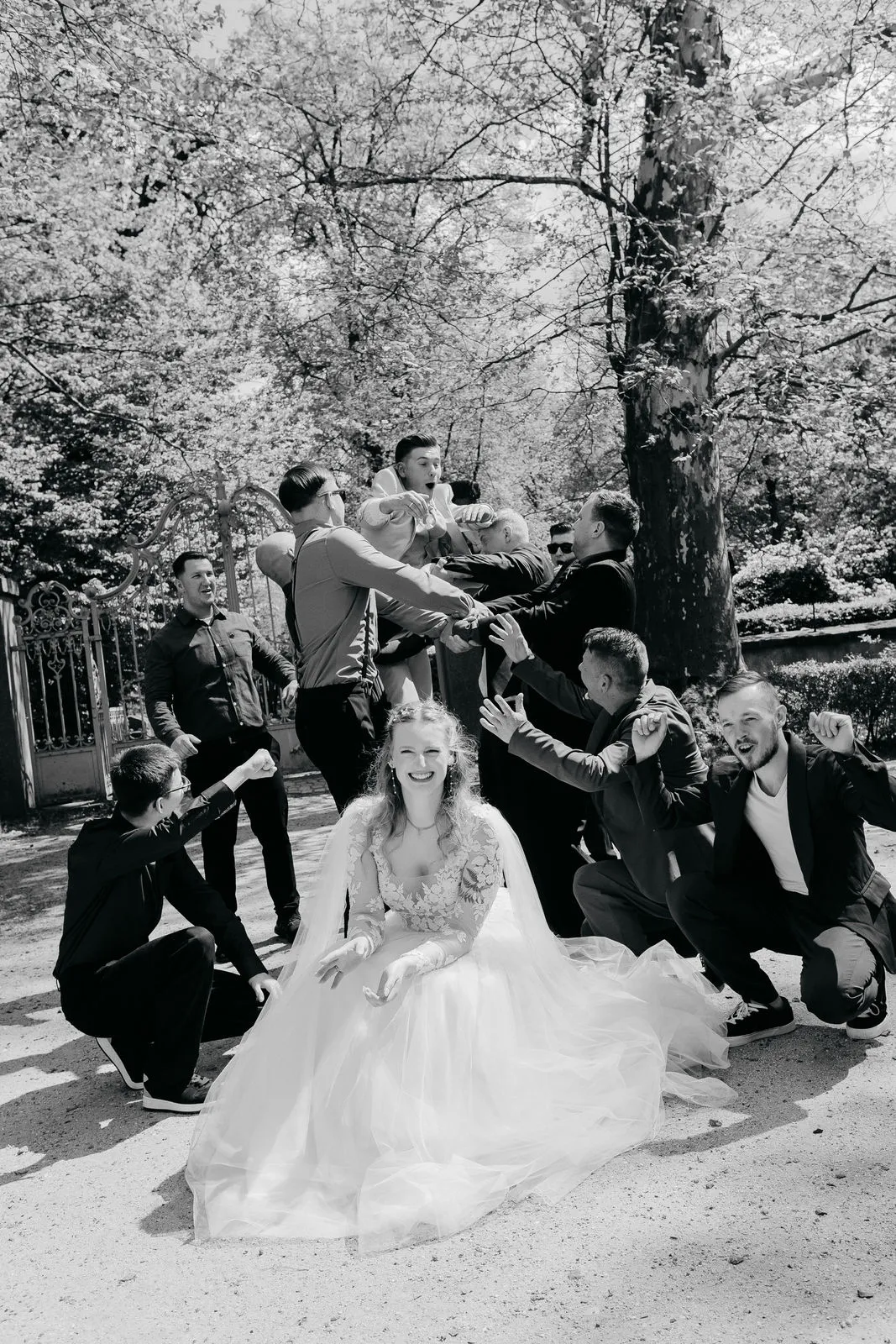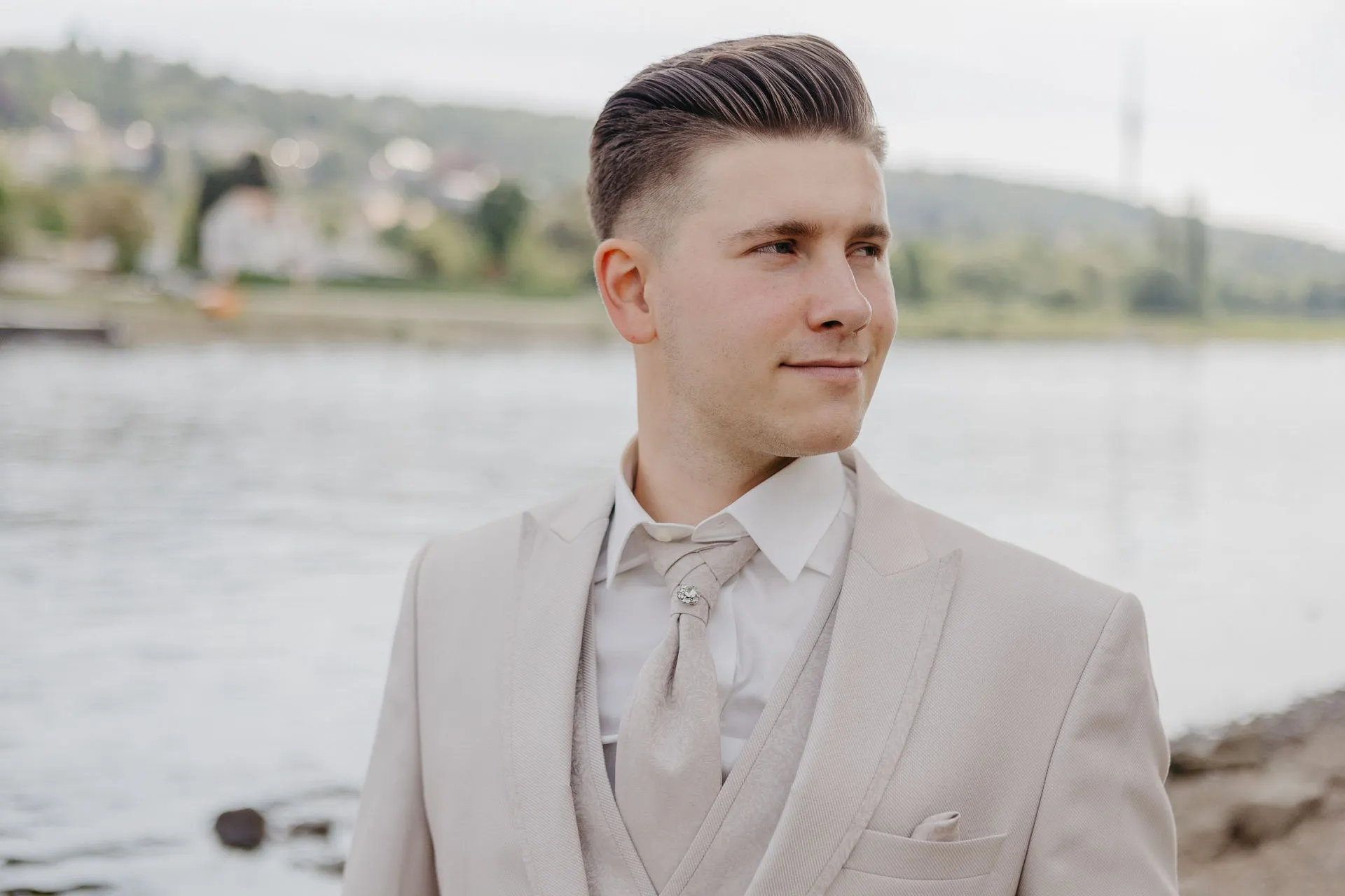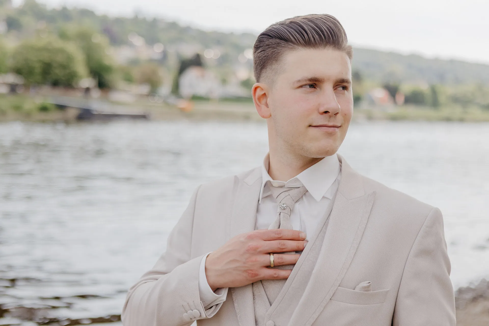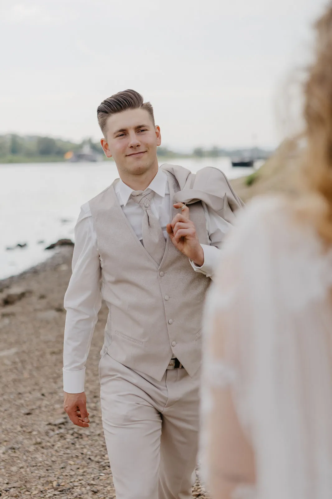 Nach der Trauung zog die kleine Gesellschaft – bestehend aus den engsten Freunden und der Familie – gemütlich entlang der Elbe Richtung Blaues Wunder. Eine Strecke, die nicht nur traumhaft schön ist, sondern auch viele Gelegenheiten für spontane Fotos bietet. Und das Beste: Als wir gerade mit den Paarfotos an der Elbe beschäftigt waren, fuhr ein Dampfer vorbei und hupte uns freundlich zu. Ein Moment, der uns alle zum Lachen brachte – und ein echtes Highlight der Reportage wurde.