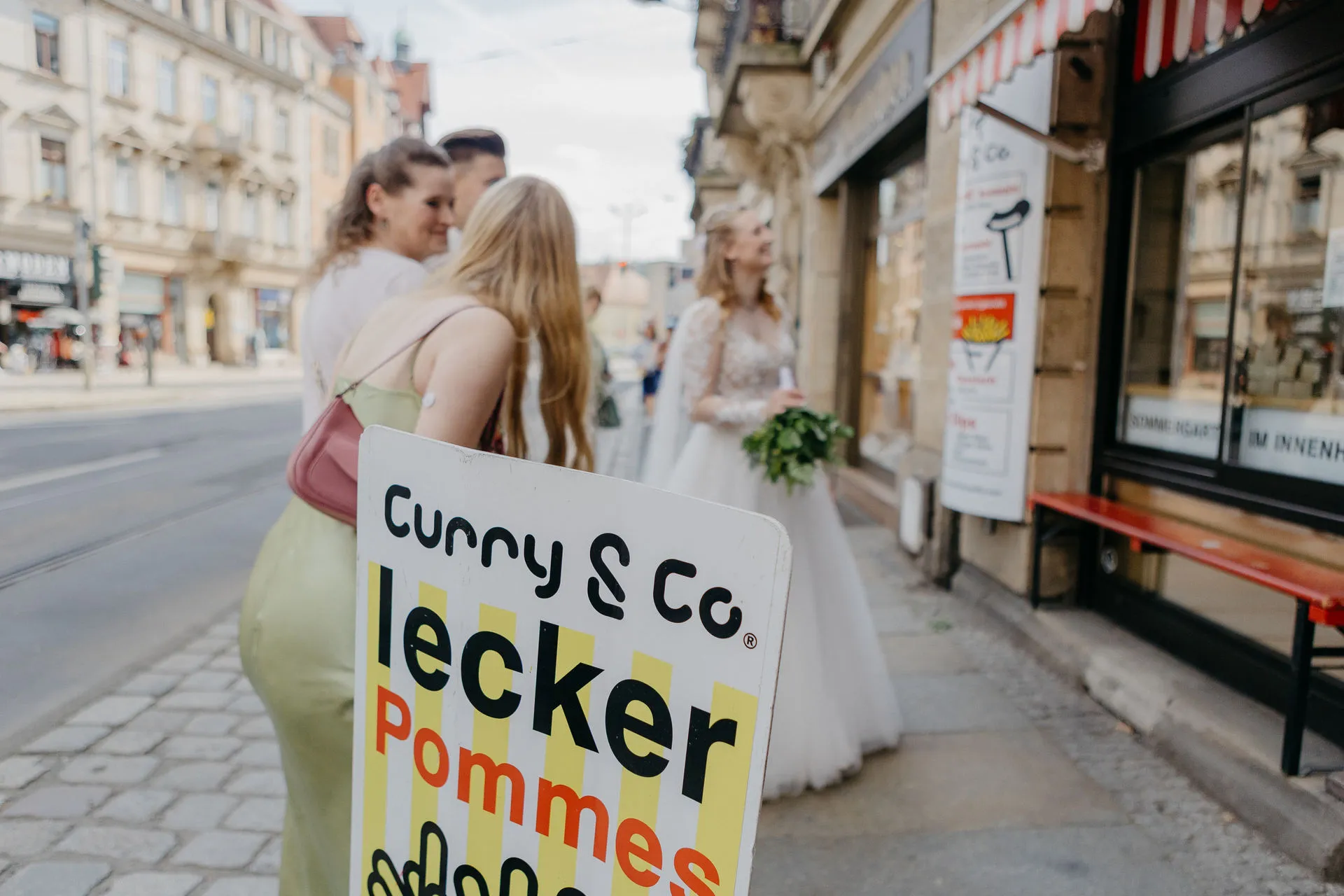 Und dann kam das Highlight, das wohl keiner vergessen wird: ein Mittagessen bei Curry & Co. Ja, richtig gelesen – Hochzeit mit Currywurst und Pommes! Eine großartige Idee, die perfekt zu Lisa & David passte.