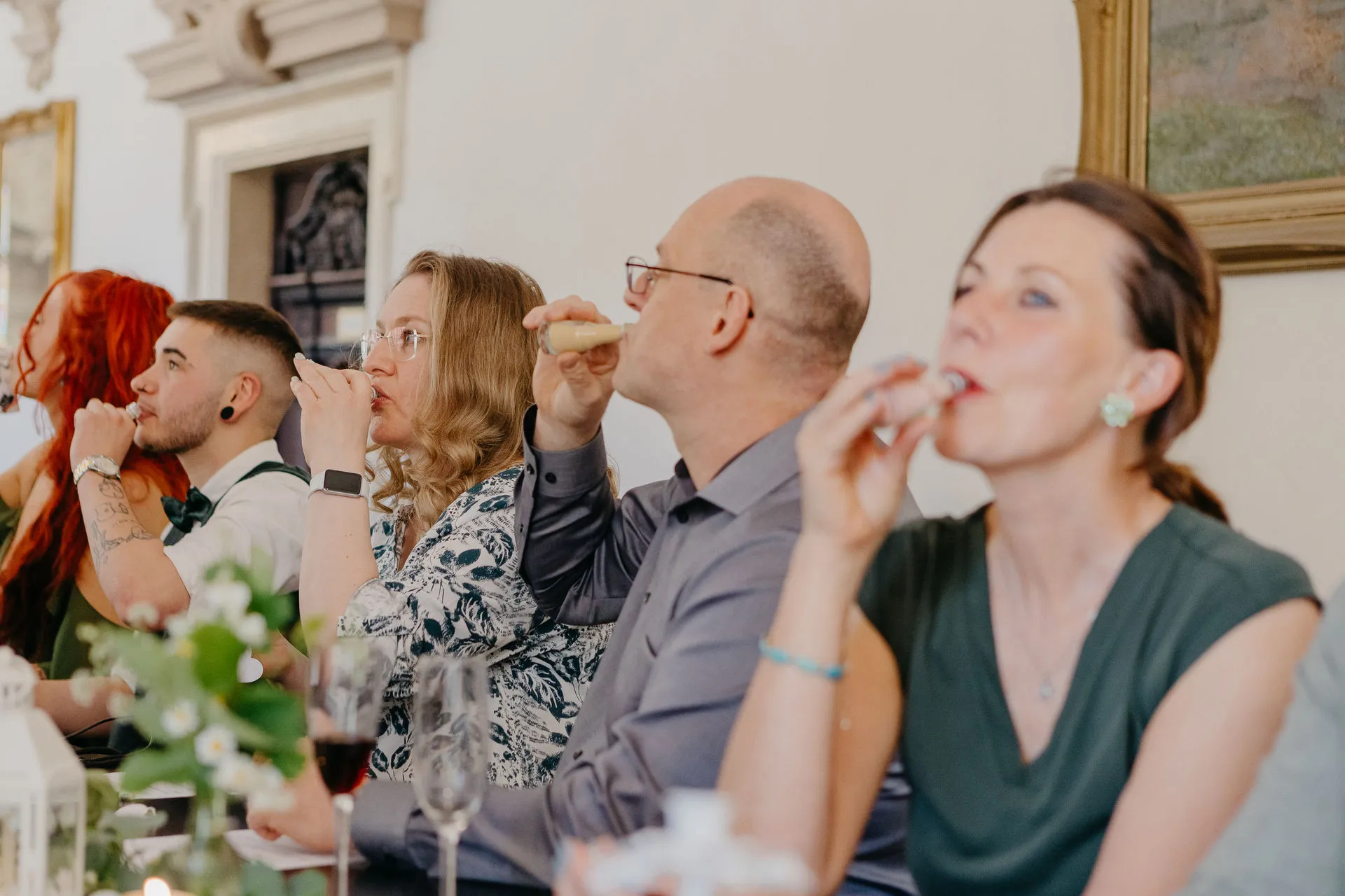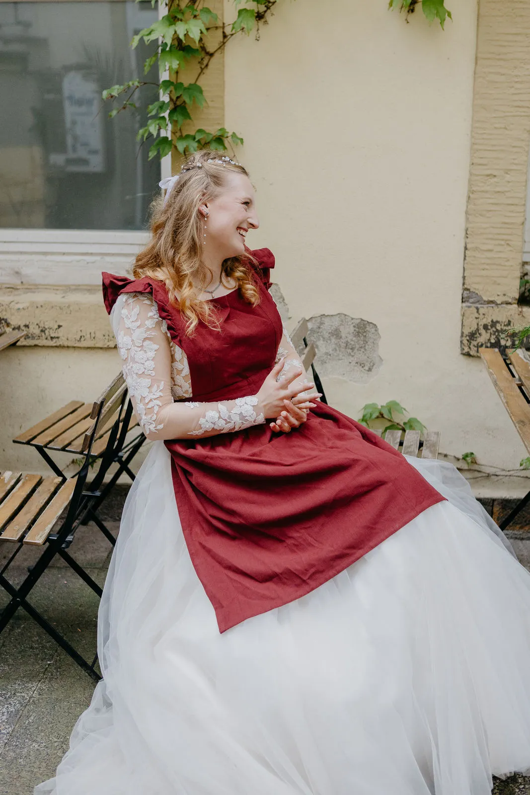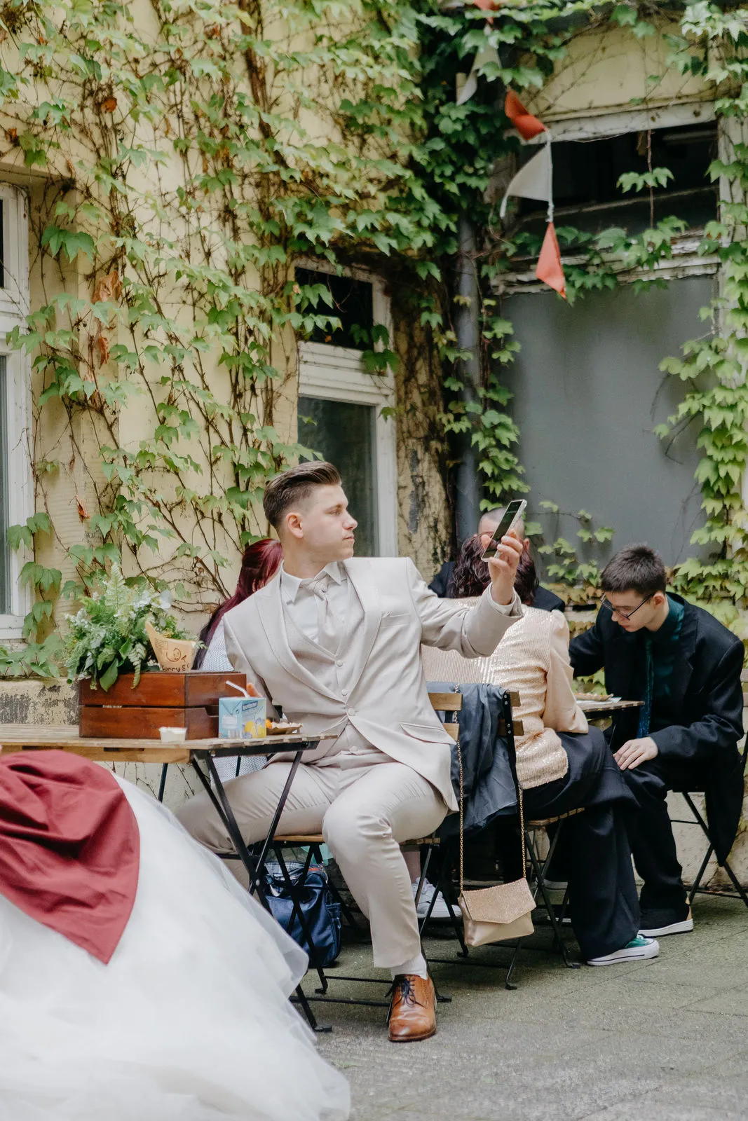 Im charmanten Innenhof des Restaurants wurde gegessen, gelacht und angestoßen. Ich muss gestehen: Ich kannte den Innenhof vorher gar nicht – und war begeistert! Diese Mischung aus urbanem Flair und Gemütlichkeit passte wunderbar zu dieser lockeren, liebevollen Gesellschaft. Keine Spur von steifem Hochzeitsprotokoll – einfach ein ehrlicher, authentischer Moment, so wie ich ihn als Hochzeitsfotografin aus der Nähe von Dresden liebe.