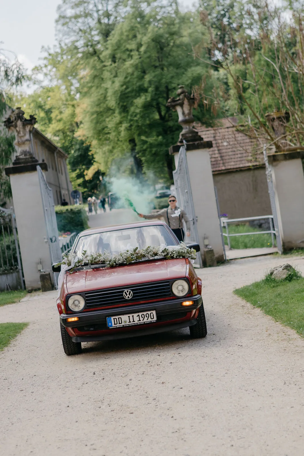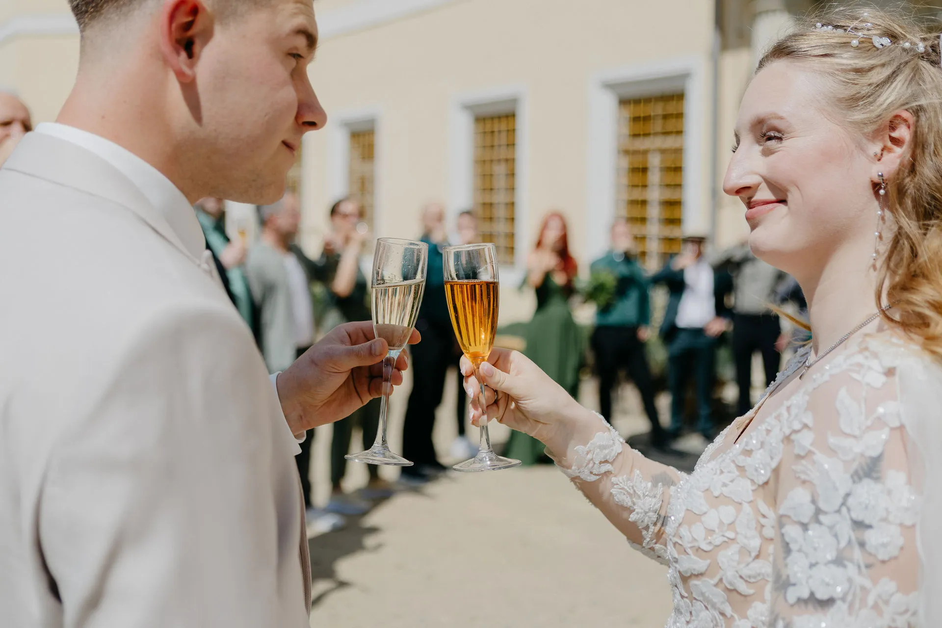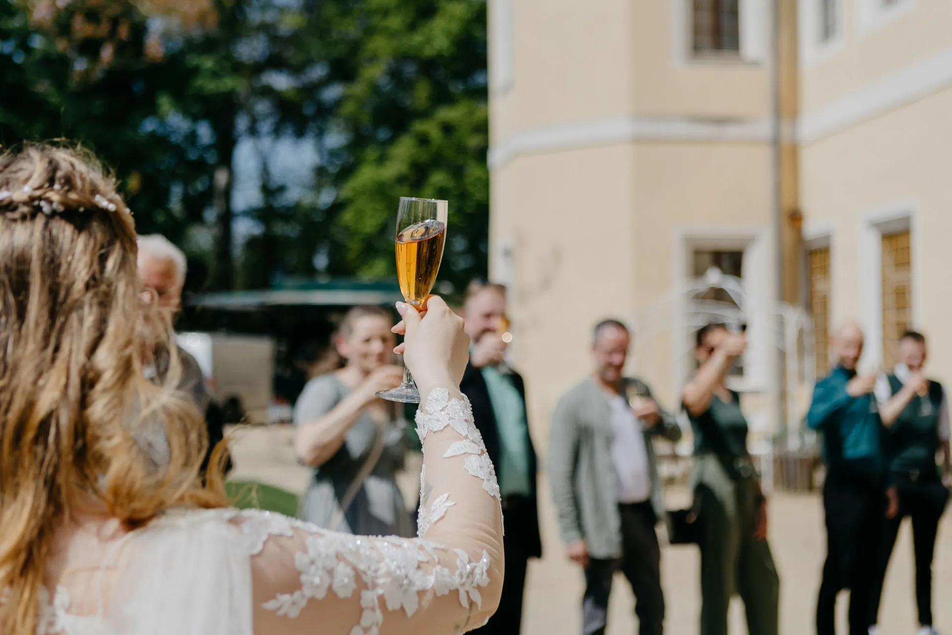 Nach dem entspannten Mittagessen ging es weiter zur eigentlichen Feier – ins Schloss Hermsdorf bei Ottendorf-Okrilla. Dieses kleine, wunderschöne Schloss ist ein echter Geheimtipp für Hochzeiten in Sachsen. Es liegt idyllisch in einem grünen Park, nur wenige Kilometer von Dresden entfernt, und bietet mit seinen hellen Sälen und der großen Außenfläche eine traumhafte Kulisse für jede Feier.