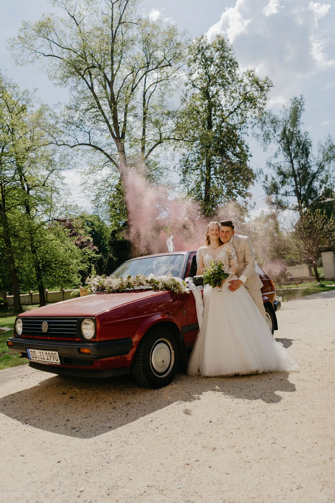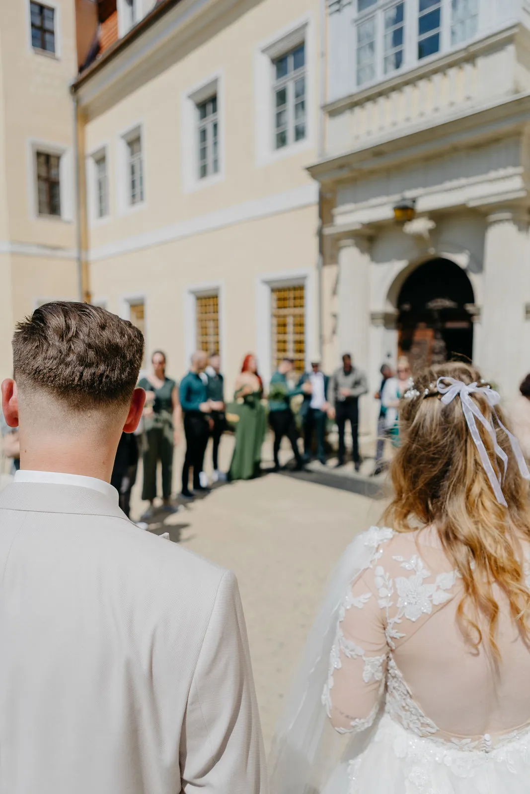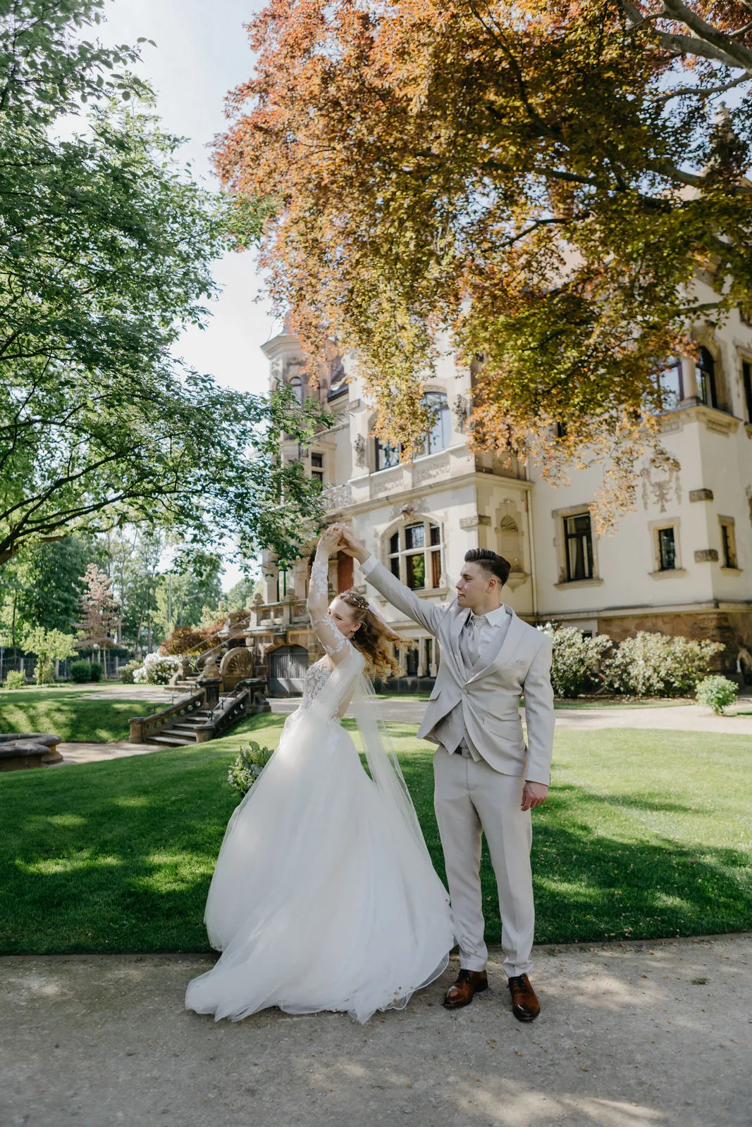 Nach dem entspannten Mittagessen ging es weiter zur eigentlichen Feier – ins Schloss Hermsdorf bei Ottendorf-Okrilla. Dieses kleine, wunderschöne Schloss ist ein echter Geheimtipp für Hochzeiten in Sachsen. Es liegt idyllisch in einem grünen Park, nur wenige Kilometer von Dresden entfernt, und bietet mit seinen hellen Sälen und der großen Außenfläche eine traumhafte Kulisse für jede Feier.