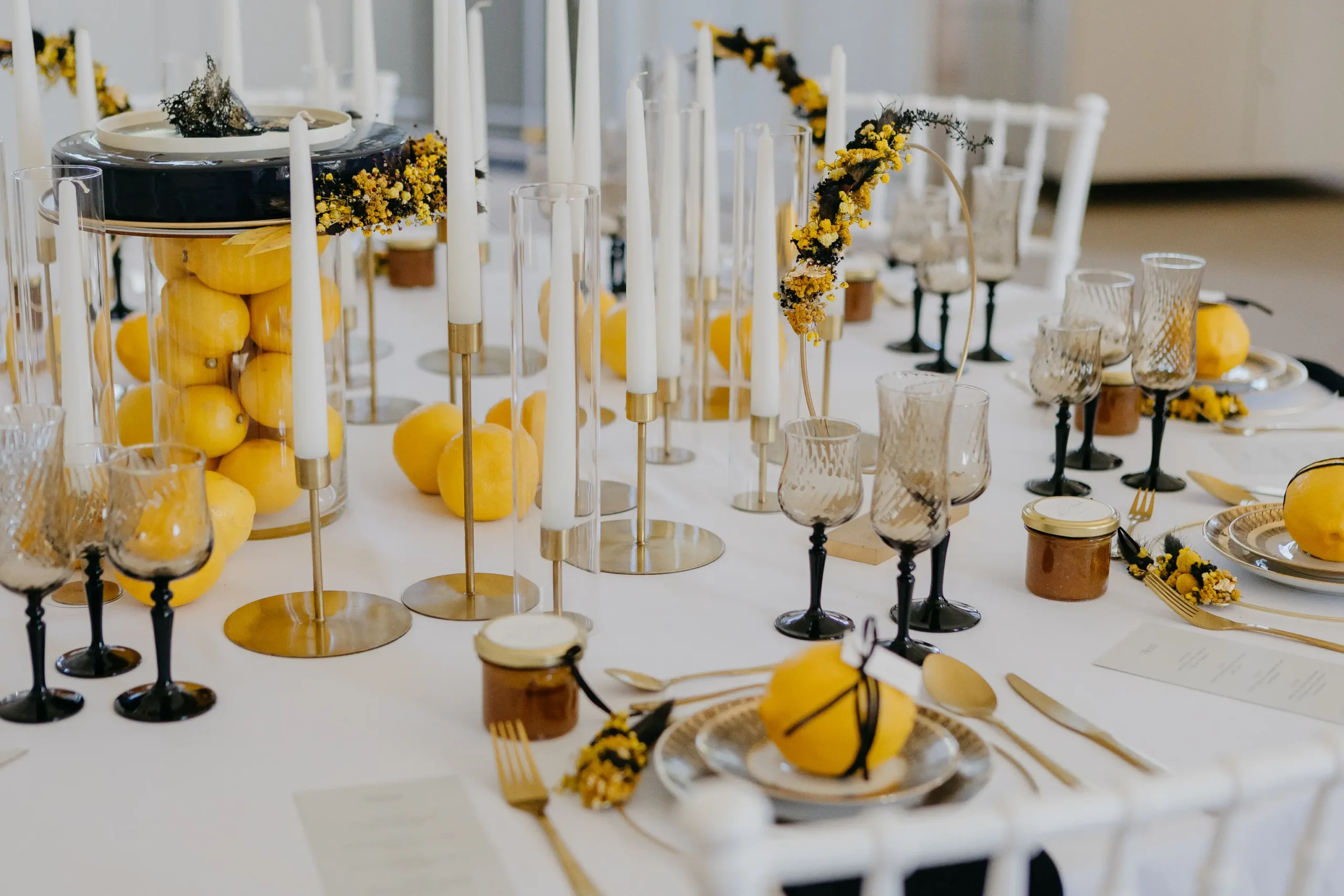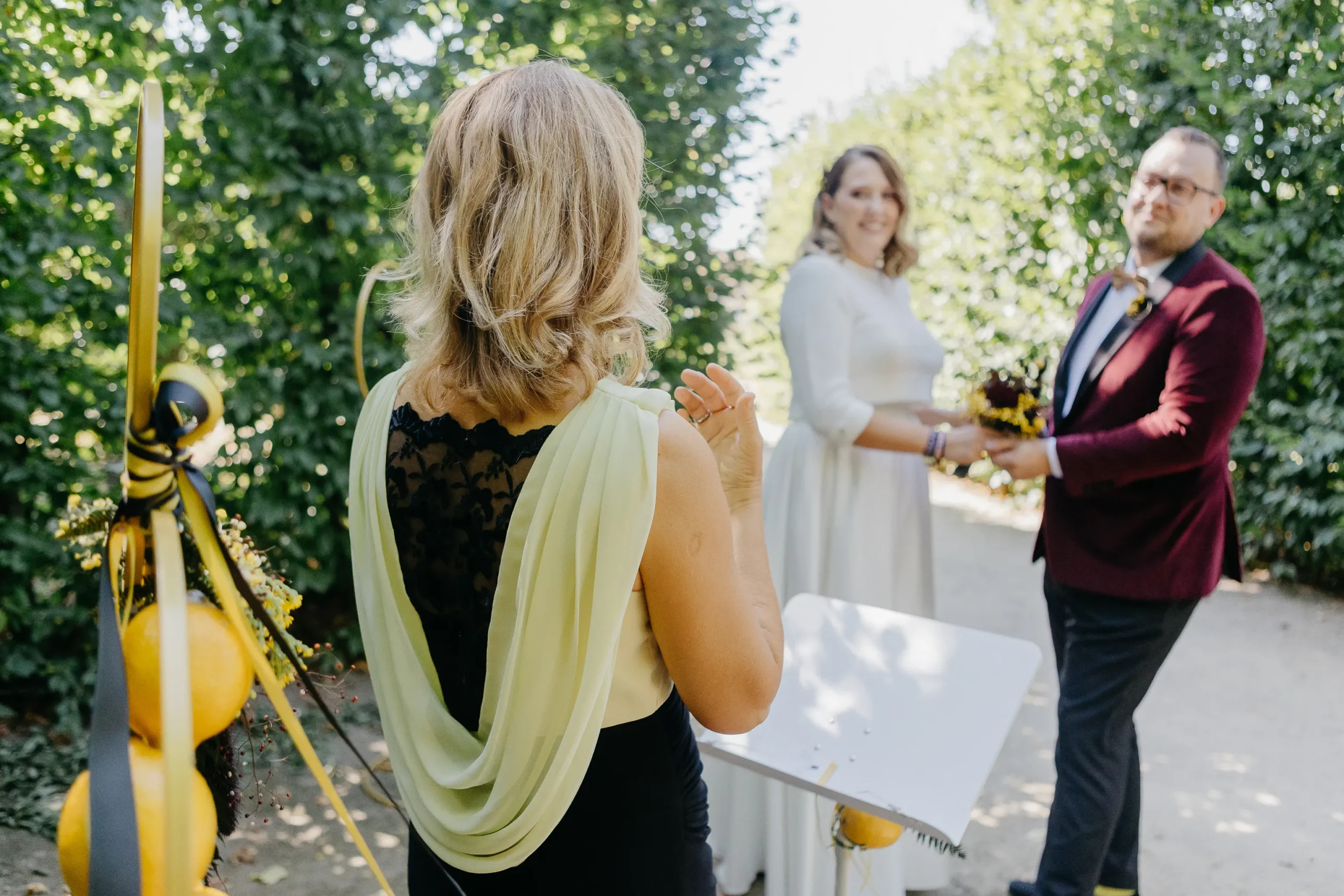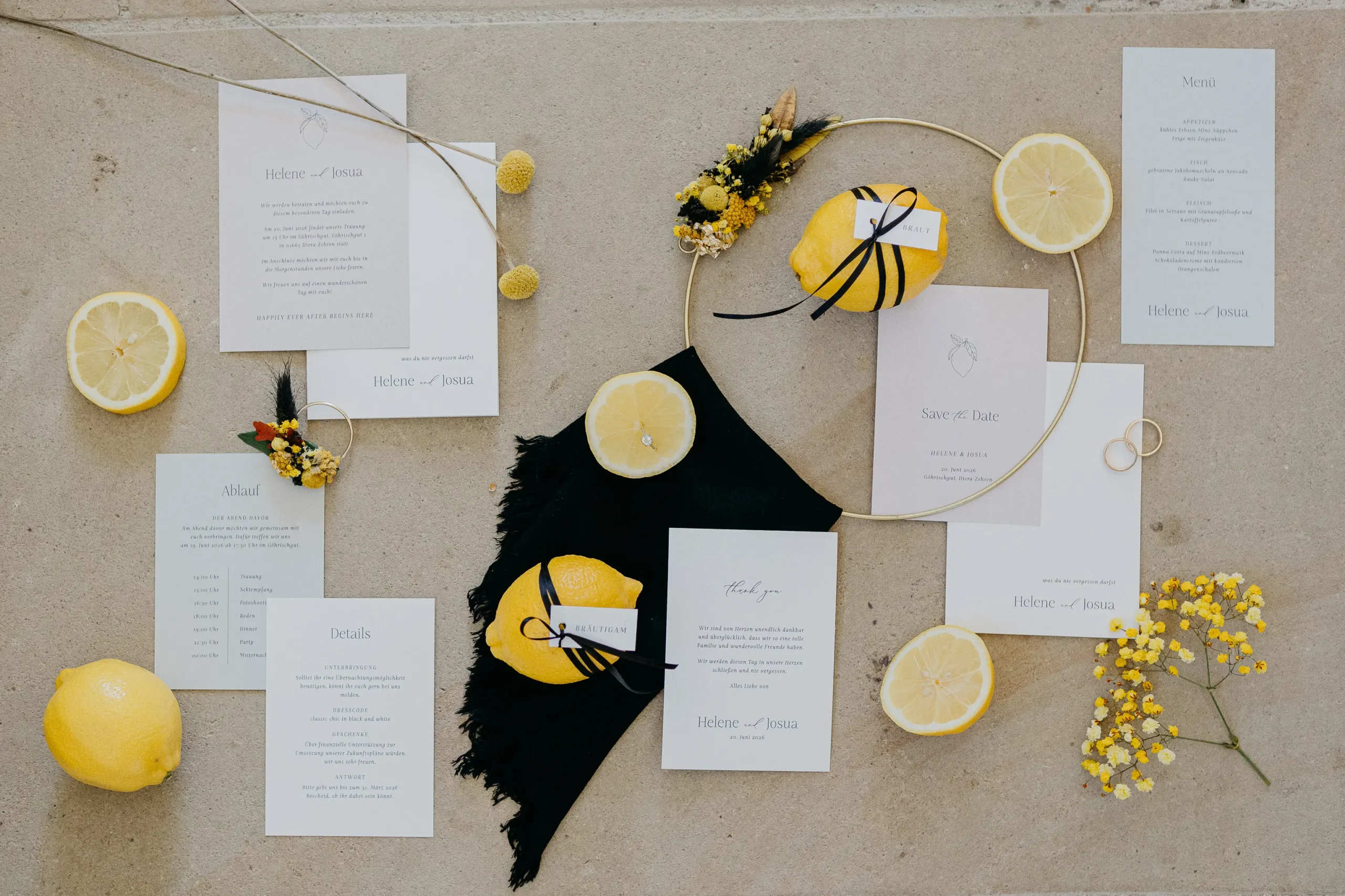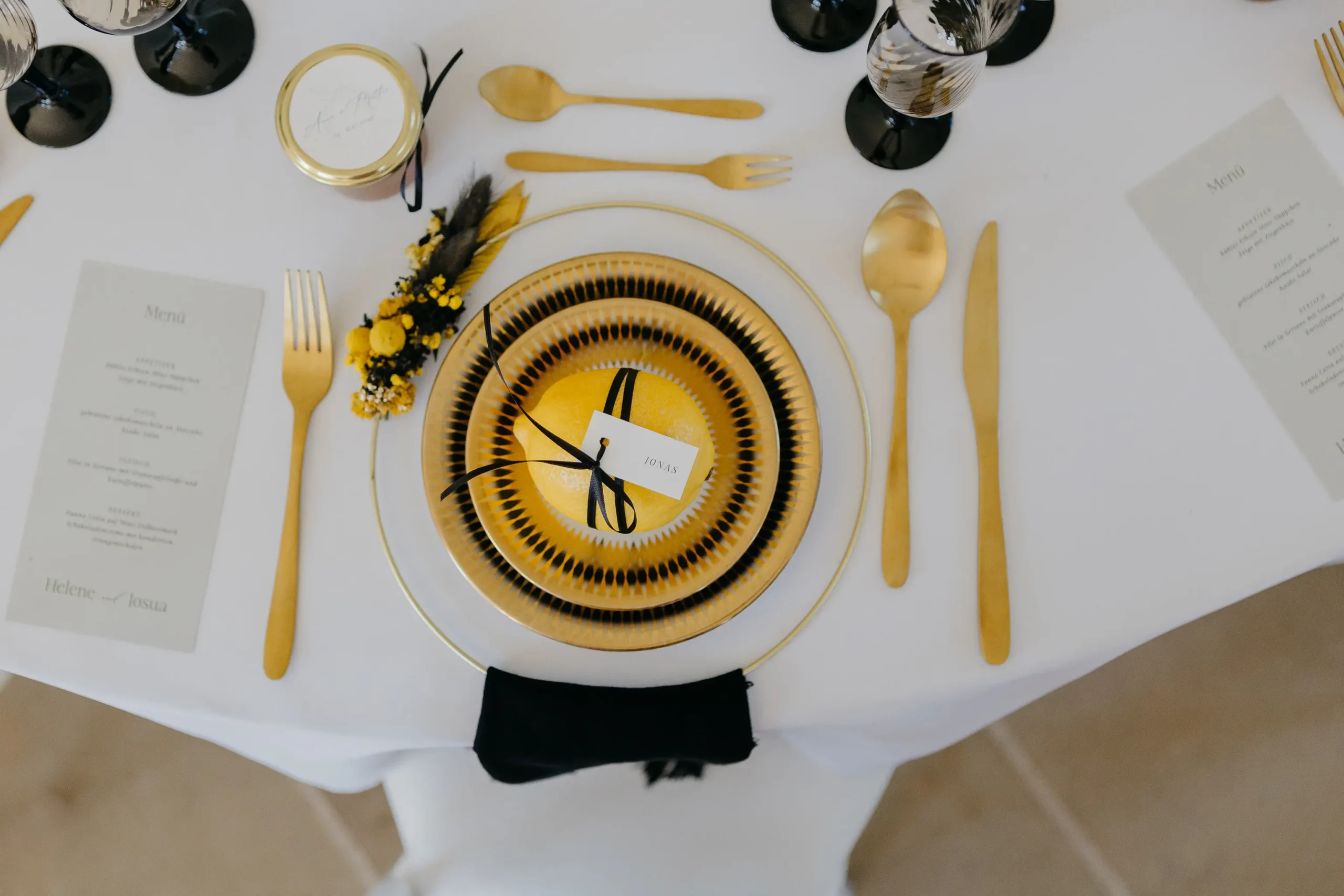 hat mit ihrem Team eine atemberaubende Tafel gezaubert. Leuchtende Zitrusfarben – von strahlendem Gelb über kräftiges Orange bis hin zu sattem Grün – zogen sich durch das gesamte Konzept. Sorgfältig ausgewählte Sammeltassen ergänzten das Bild perfekt und verliehen der Szenerie einen nostalgisch-eleganten Charme. Die floralen Arrangements von @herz_gruen fügten sich nahtlos ein und schufen gemeinsam mit den Dekoelementen von @wolfconcepts ein harmonisches Gesamtbild. Dazu kamen kunstvolle Sweets von @pastry_jazz, die nicht nur köstlich aussahen, sondern auch die Farbwelt perfekt aufgriffen. Ein weiteres Highlight war der Traubogen von @maerchenhaftdeko, der in Kombination mit den eleganten Stühlen von @event_verleih_dresden ein stimmiges Ensemble ergab. Jedes Detail, von der Papeterie der @blattgoldmanufaktur bis zu den liebevollen Gastgeschenken von