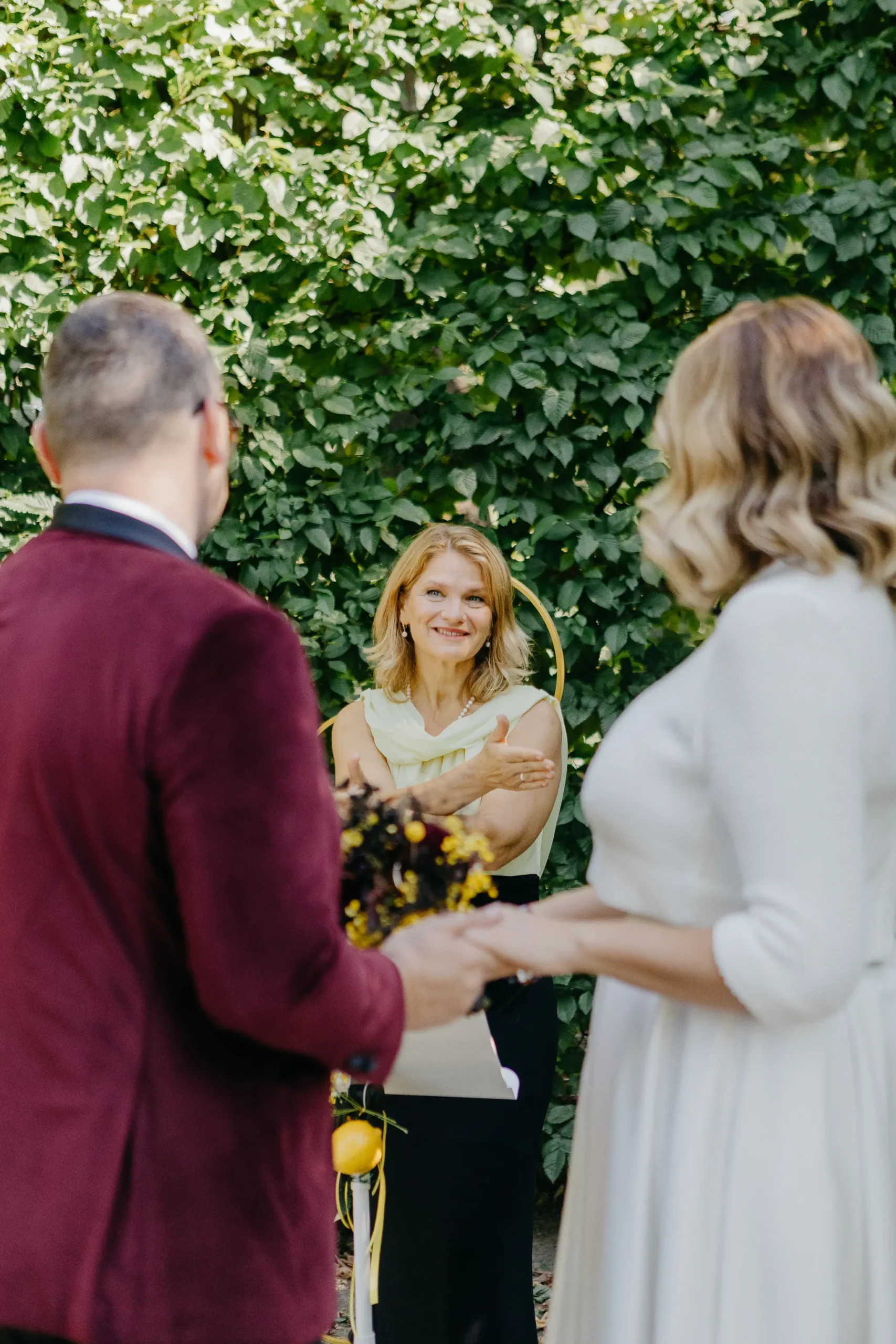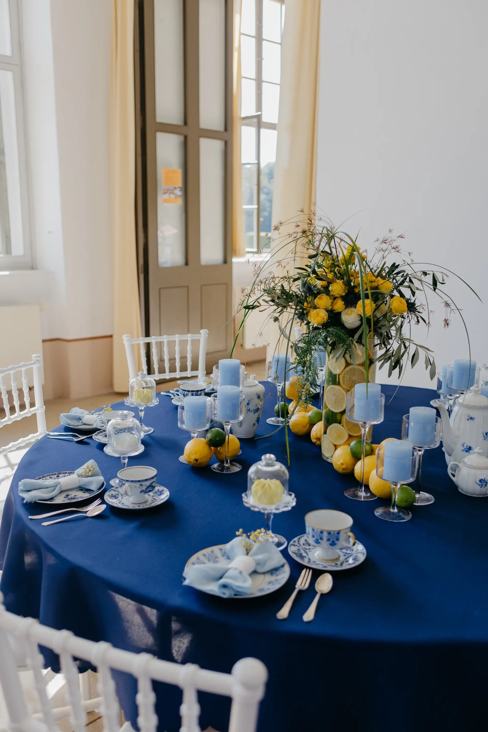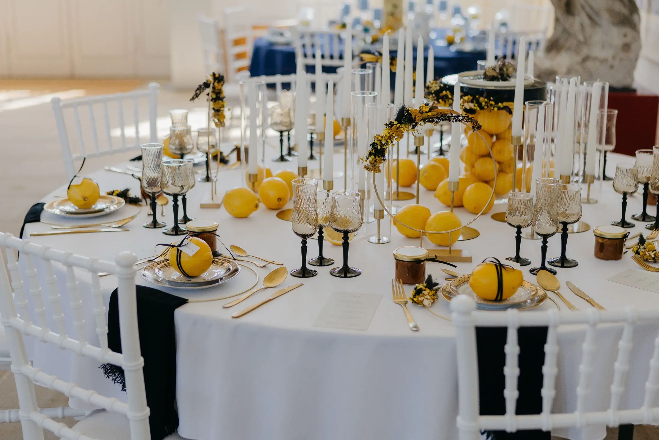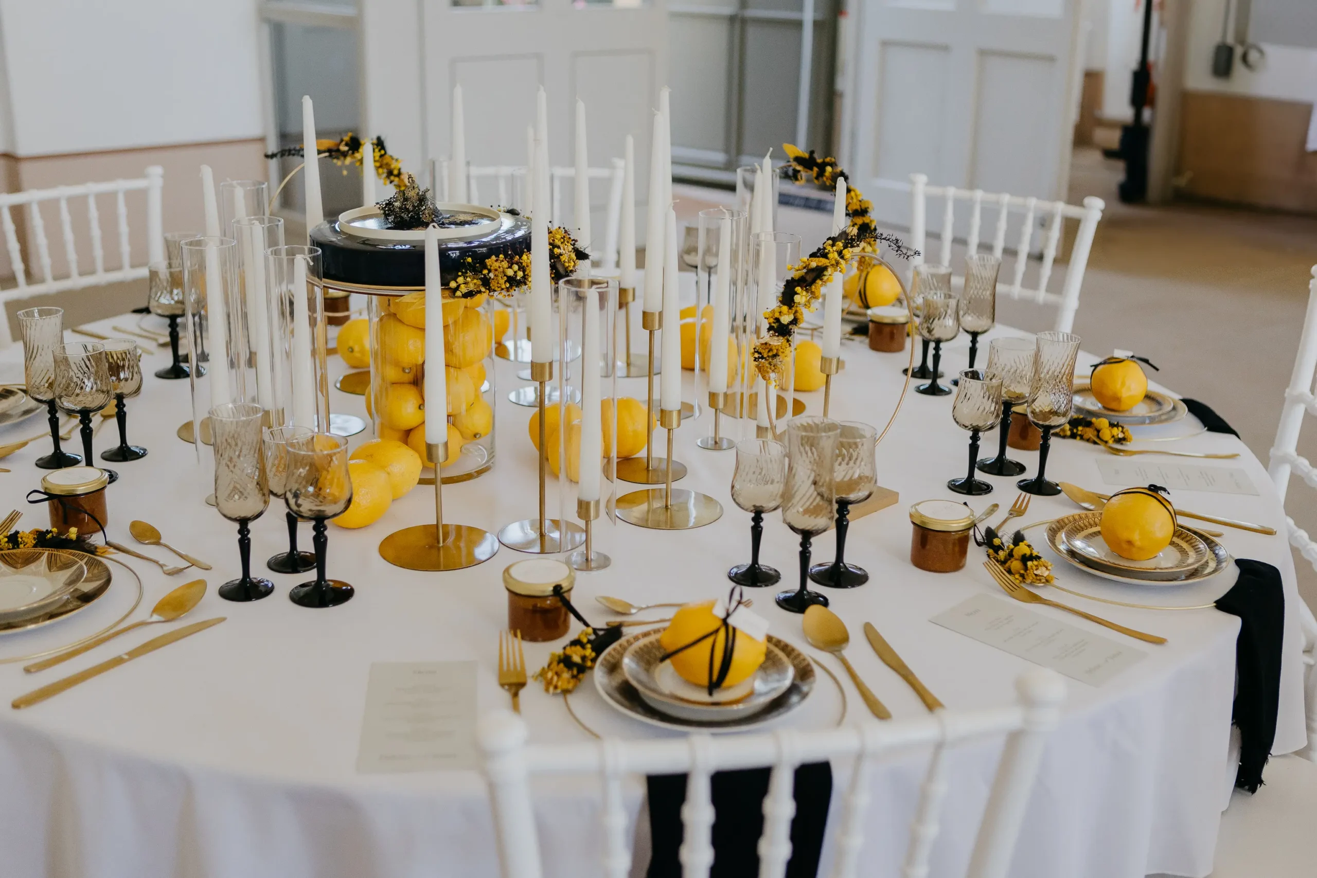 hat mit ihrem Team eine atemberaubende Tafel gezaubert. Leuchtende Zitrusfarben – von strahlendem Gelb über kräftiges Orange bis hin zu sattem Grün – zogen sich durch das gesamte Konzept. Sorgfältig ausgewählte Sammeltassen ergänzten das Bild perfekt und verliehen der Szenerie einen nostalgisch-eleganten Charme. Die floralen Arrangements von @herz_gruen fügten sich nahtlos ein und schufen gemeinsam mit den Dekoelementen von @wolfconcepts ein harmonisches Gesamtbild. Dazu kamen kunstvolle Sweets von @pastry_jazz, die nicht nur köstlich aussahen, sondern auch die Farbwelt perfekt aufgriffen. Ein weiteres Highlight war der Traubogen von @maerchenhaftdeko, der in Kombination mit den eleganten Stühlen von @event_verleih_dresden ein stimmiges Ensemble ergab. Jedes Detail, von der Papeterie der @blattgoldmanufaktur bis zu den liebevollen Gastgeschenken von