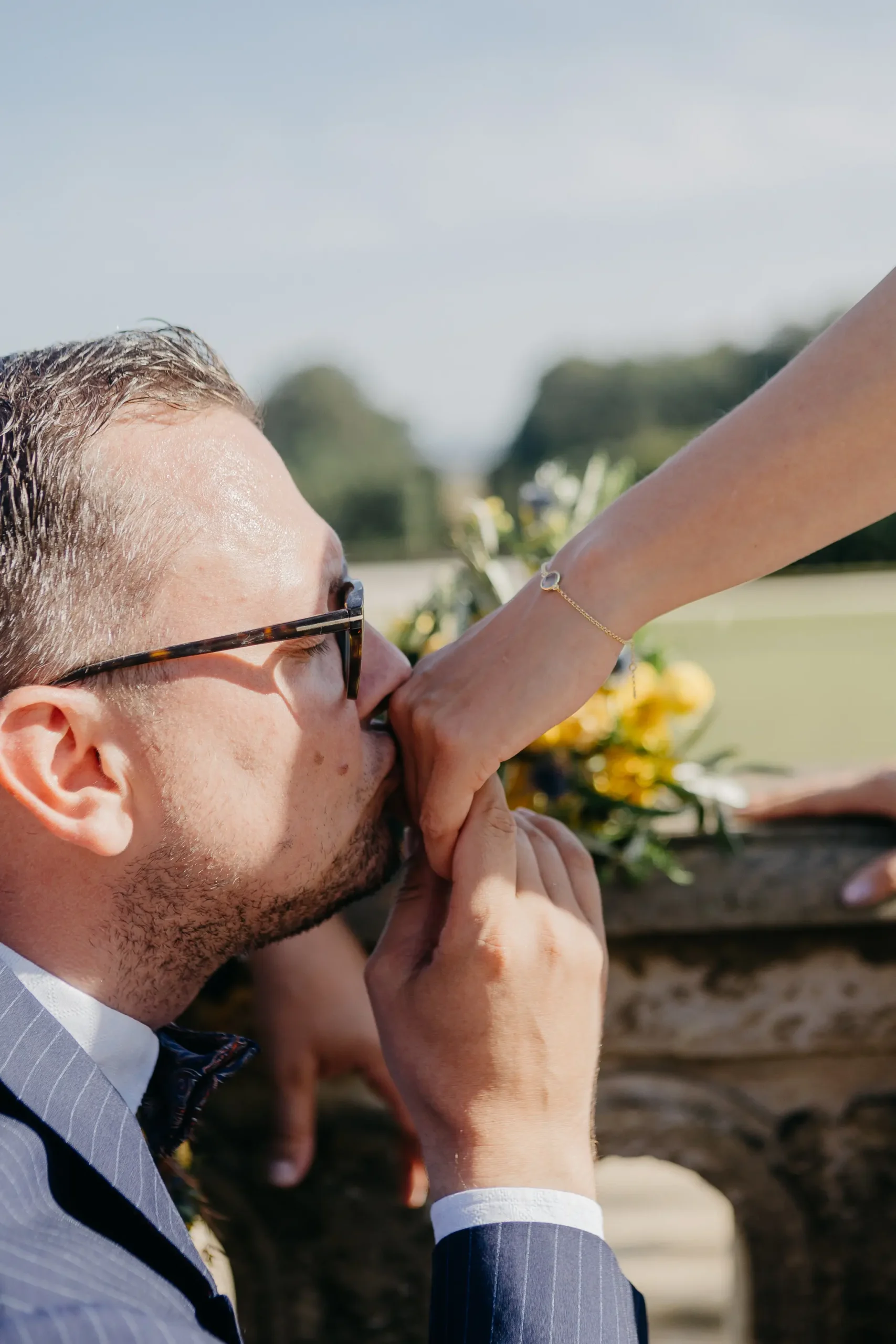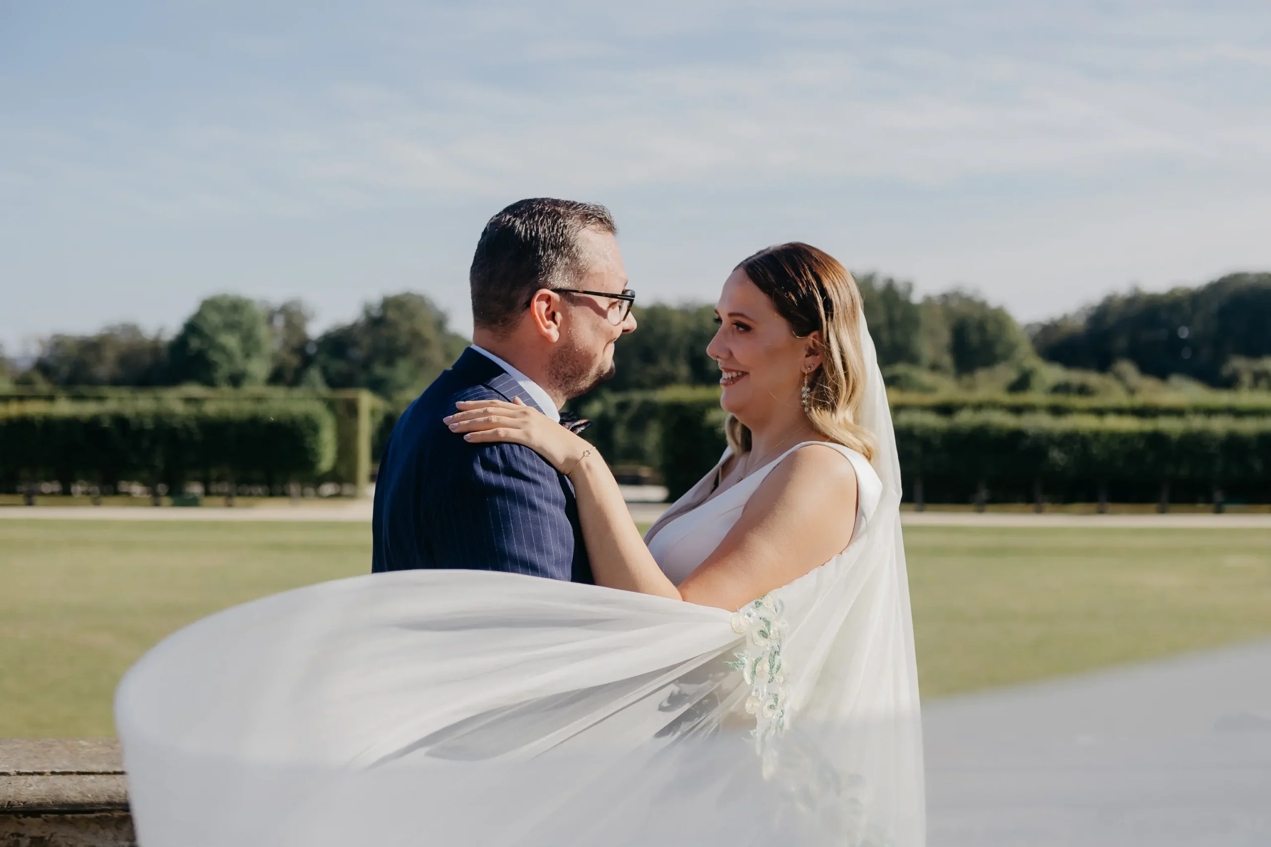 Natürlich darf bei einem Styled Shoot das richtige Outfit nicht fehlen. Das Brautkleid von @schwesterderbraut harmonierte perfekt mit dem sommerlichen Konzept. Dazu trug @floral_verbunden einen zarten Schleier bei, der im warmen Sonnenlicht wunderschön spielte. Ricos Anzug stammte – wie könnte es anders sein – aus dem Atelier von @holzendorfundgraefe. Elegant, modern und perfekt auf das Thema abgestimmt. Schmuck von @miaundmartha_schmuck